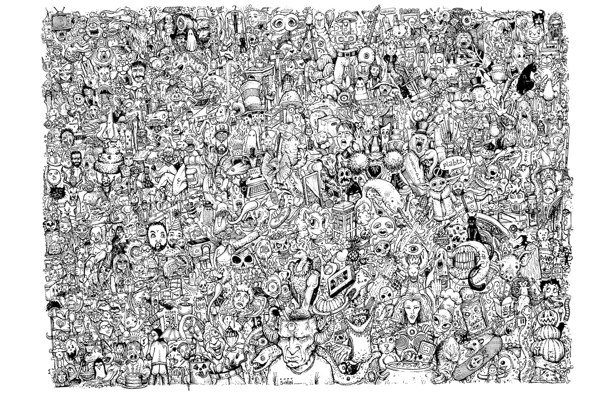 What the hell is going on here?! This is a print of an ongoing (but now retired) illustration I created on my Twitch channel between April 1, 2021 thru April 1, 2025. Yep, FOUR weird years of taking small requests from the remarkable viewers over there & scribbling them on a single piece of paper. Here's your chance to look at the HUNDREDS of confusing images I drew within that timeframe & question your own sanity! 17" x 11" art print | comes hand signed by Cody Schibi....hey!...that's ME! Shipped in thick, protective mailing tube.